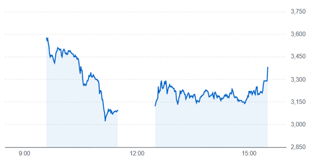 初値天井って程の下落では無いですが、9:36に初値3,570円を付け前場はダダ下がり。